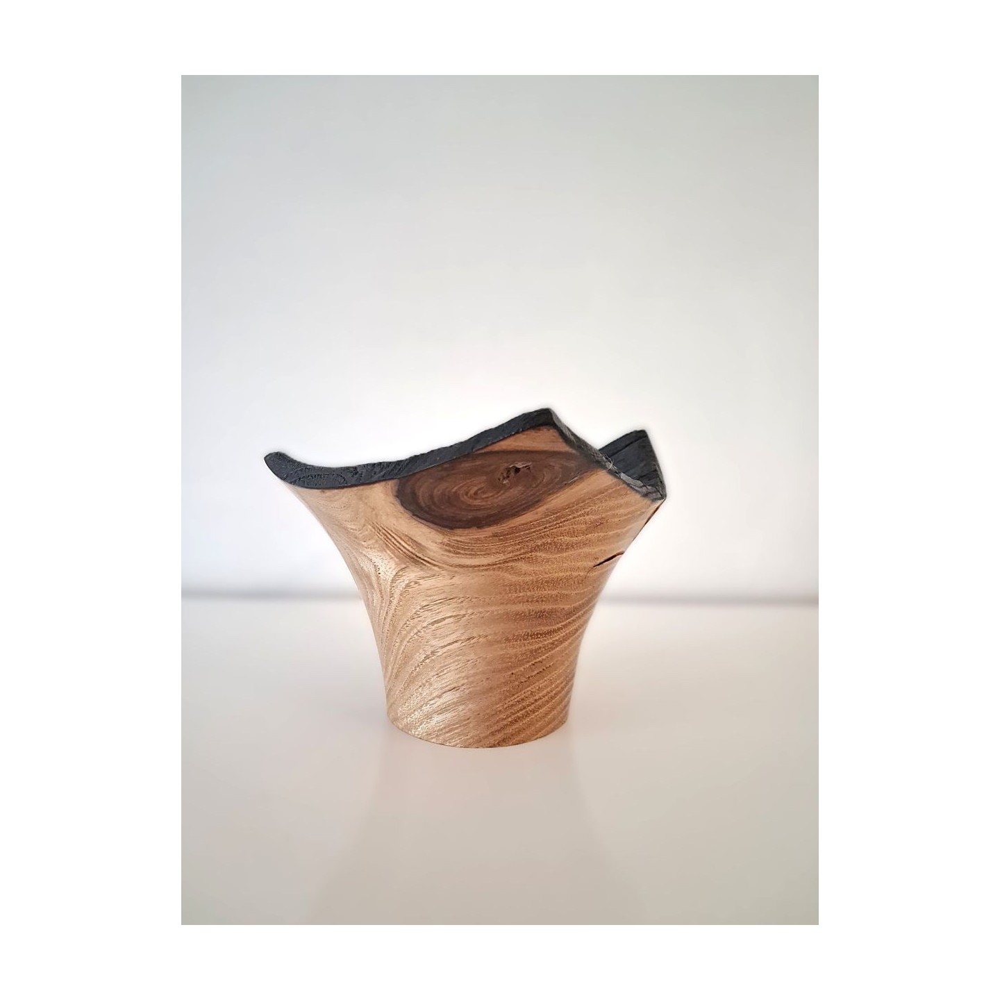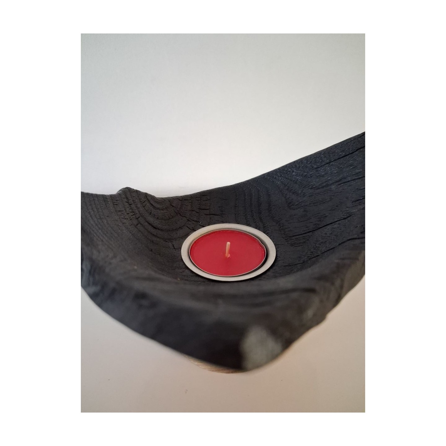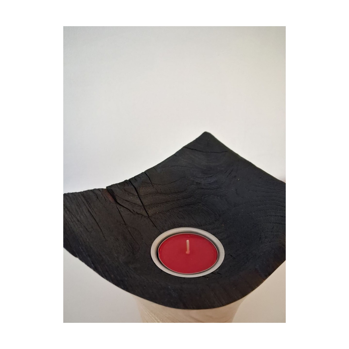 Bougeoir évasé en robinier. Le col, entièrement carbonisé, reçoit un insert en laiton argenté conçu pour accueillir une bougie chauffe-plat standard de Ø 39 mm (1 bougie par bougeoir inclus)