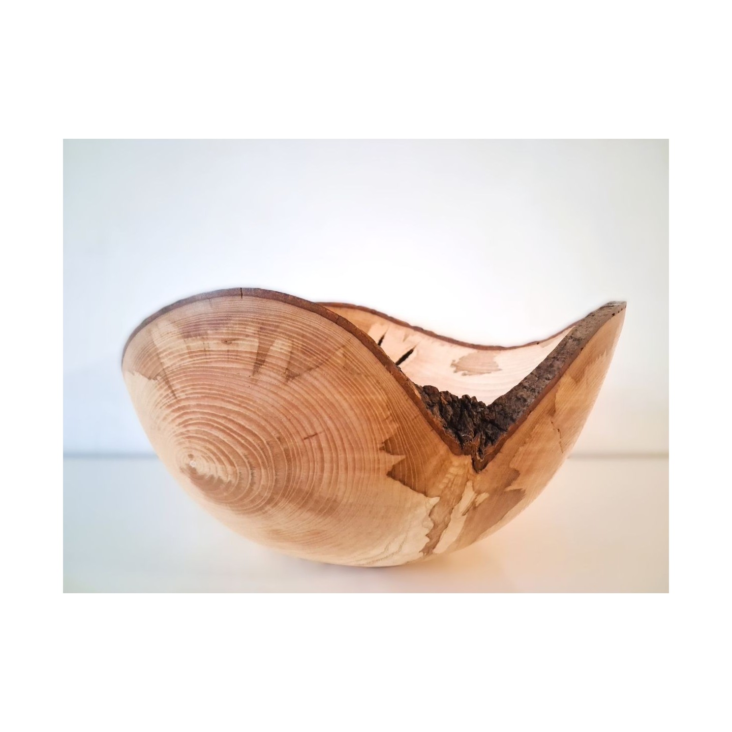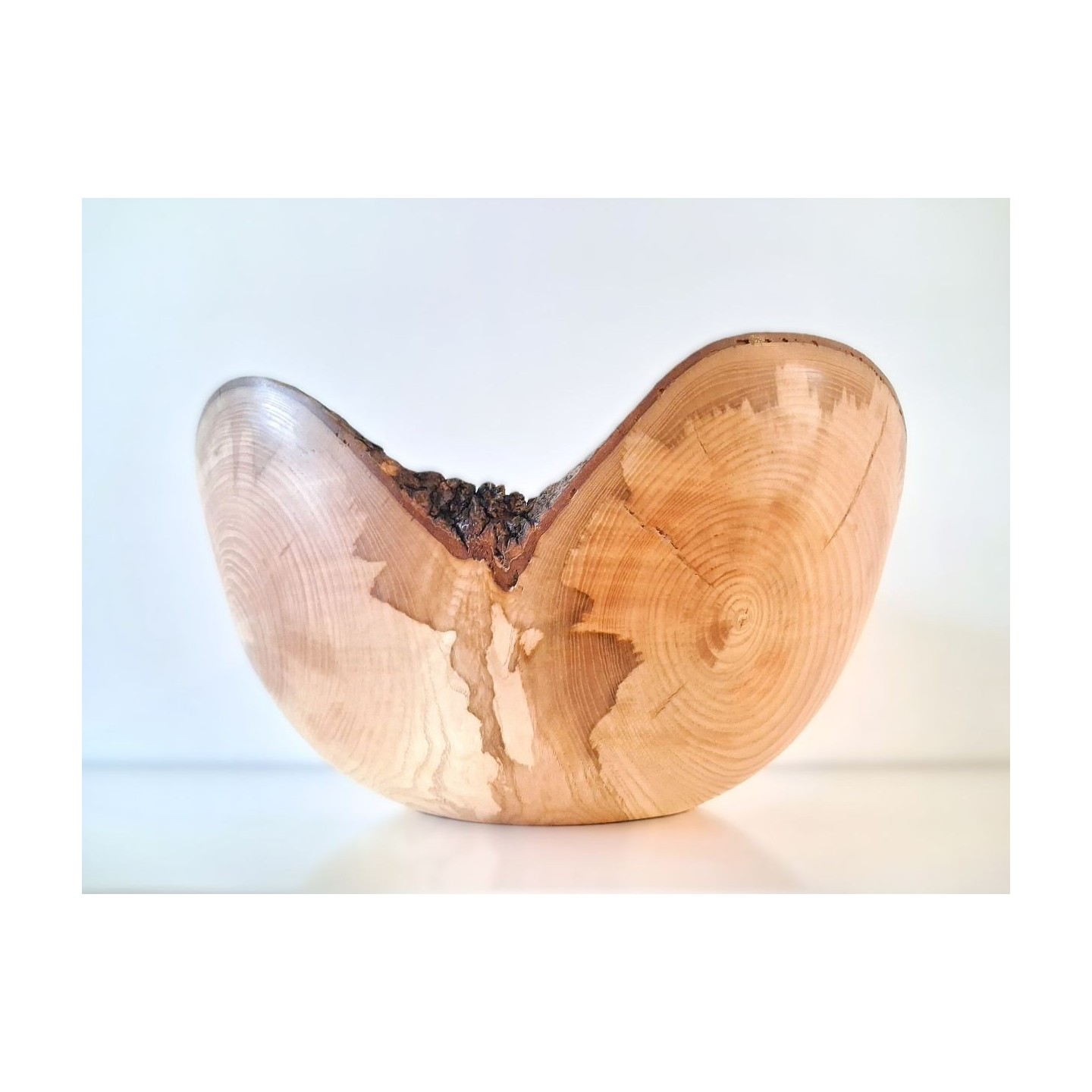 Cette coupe généreuse, tournée dans une fourche de frêne massif, met en valeur toute la beauté brute du bois.
