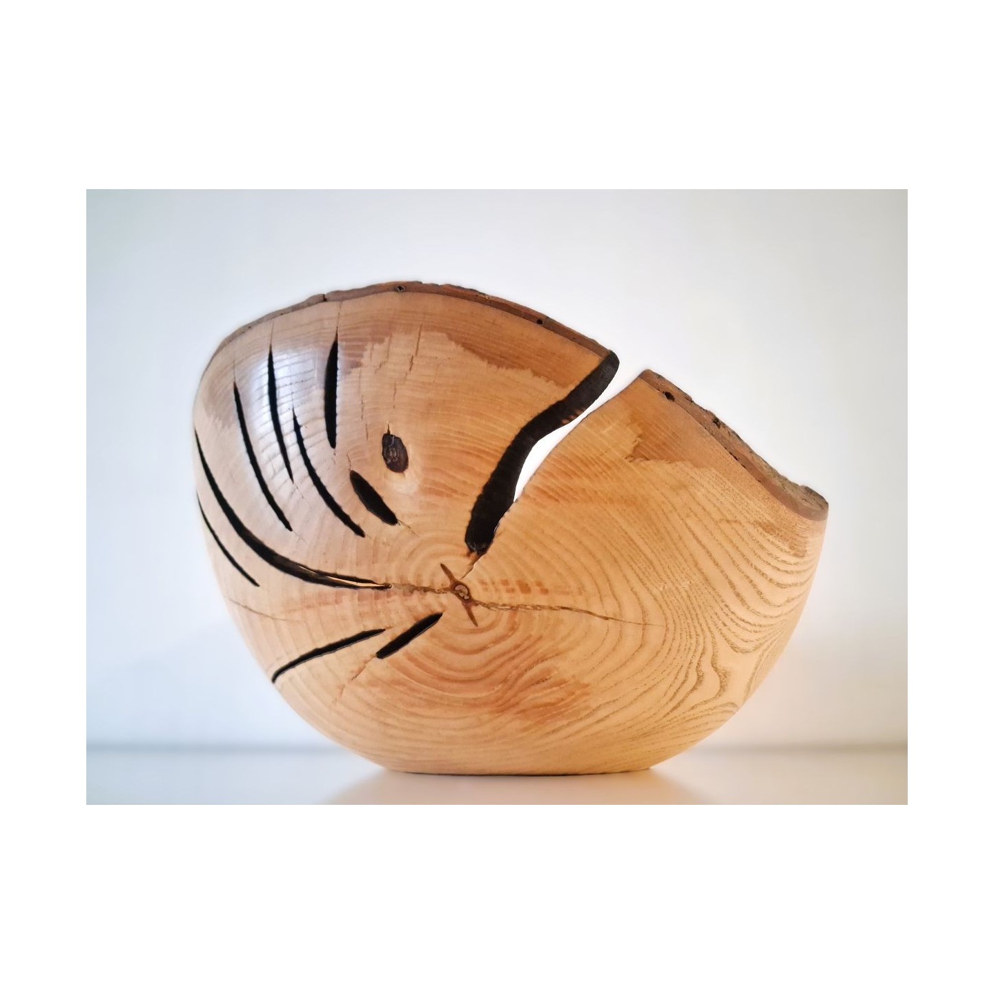 L’écorce laissée apparente et les bords naturels lui confèrent un charme authentique, qui attire immédiatement le regard. Les fentes ont été reprises : élargies, soigneusement nettoyées, puis noircies au feu.